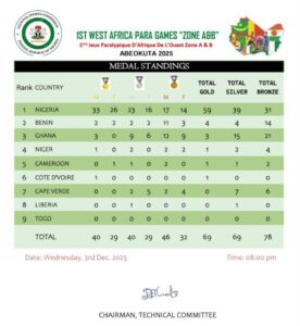 Nigeria dominated the Games, topping the medal tally with 129 across all men’s and women’s categories, including 59 golds, 39 silvers, and 31 bronzes.